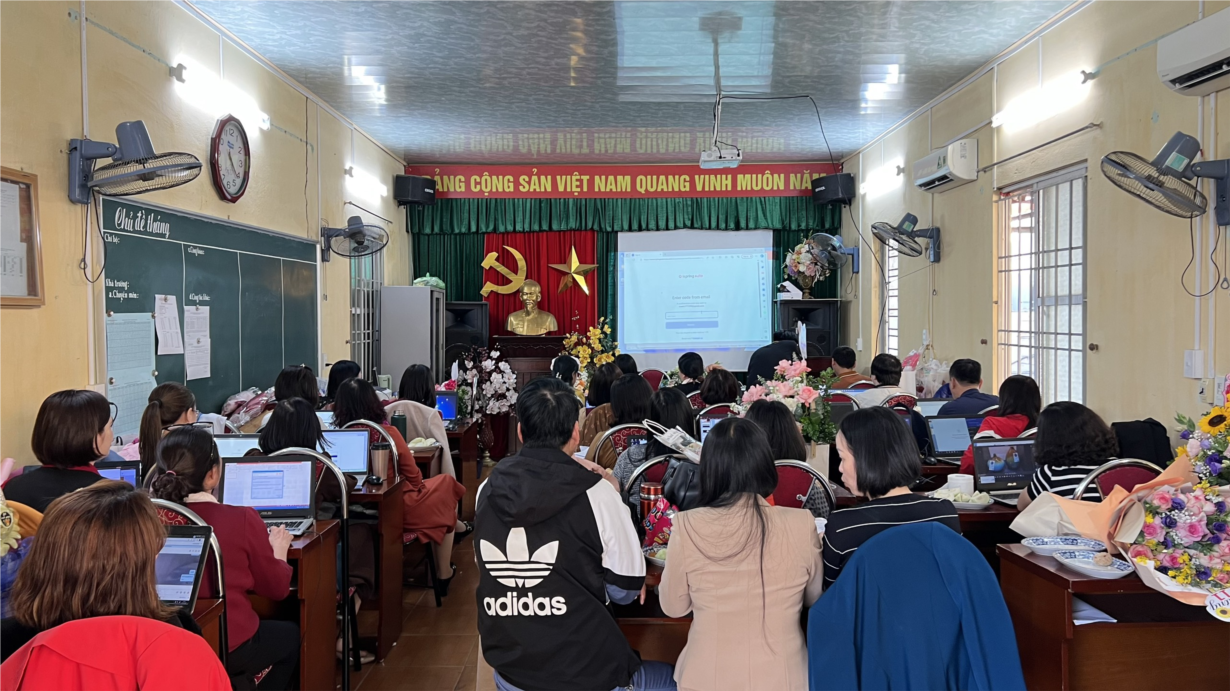 .Nhận thấy được những điểm tích cực và thực hiện chuyển đổi số, GV trường THCS Hưng Đạo tham gia buổi tập huấn do nhà trường tự tổ chức để giúp các thầy cô giáo hiểu thêm về ứng dụng này vào trong giảng dạy. Đồng thời, để tham gia vào cuộc thi thiết kế bài giảng E-learning đang được PGD phát động.