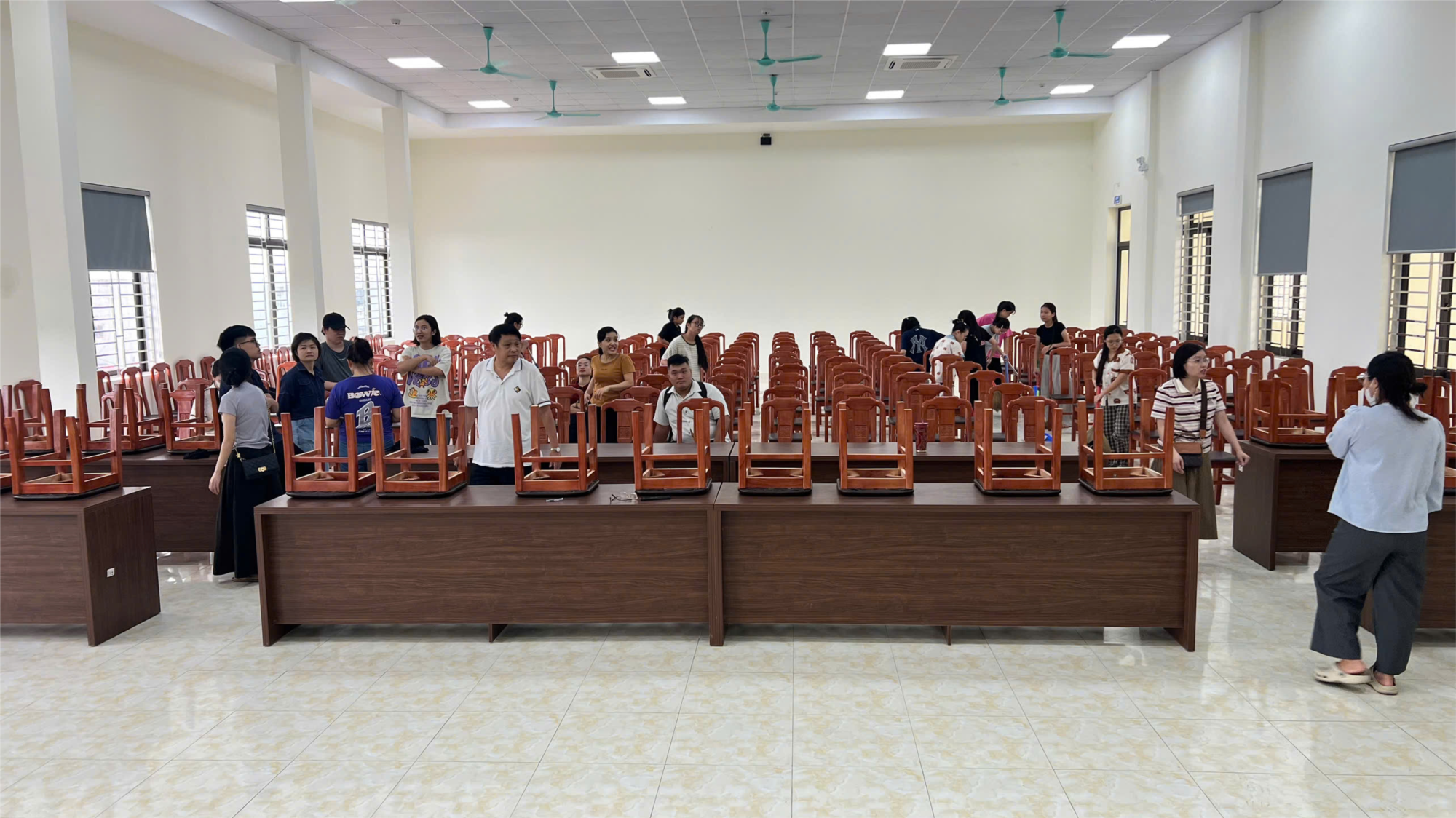 Đặc biệt, đội ngũ giáo viên trẻ, là thành viên của Đoàn Thanh niên nhà trường và thuộc cả hai tổ chuyên môn: Khoa học Xã hội (KHXH) và Khoa học Tự nhiên (KHTN), đã cùng nhau chung tay, phối hợp nhịp nhàng trong công tác chuẩn bị. Họ không chỉ dọn dẹp, sắp xếp mà còn kiểm tra lại hệ thống âm thanh, ánh sáng, Tivi, Màn hình led lớn,.... để đảm bảo mọi thứ hoạt động trơn tru cho buổi lễ khai giảng sắp tới. Sự kết hợp ăn ý này không chỉ thể hiện tinh thần đoàn kết mà còn cho thấy sự chuẩn bị chu đáo, tỉ mỉ của các thầy cô giáo.
