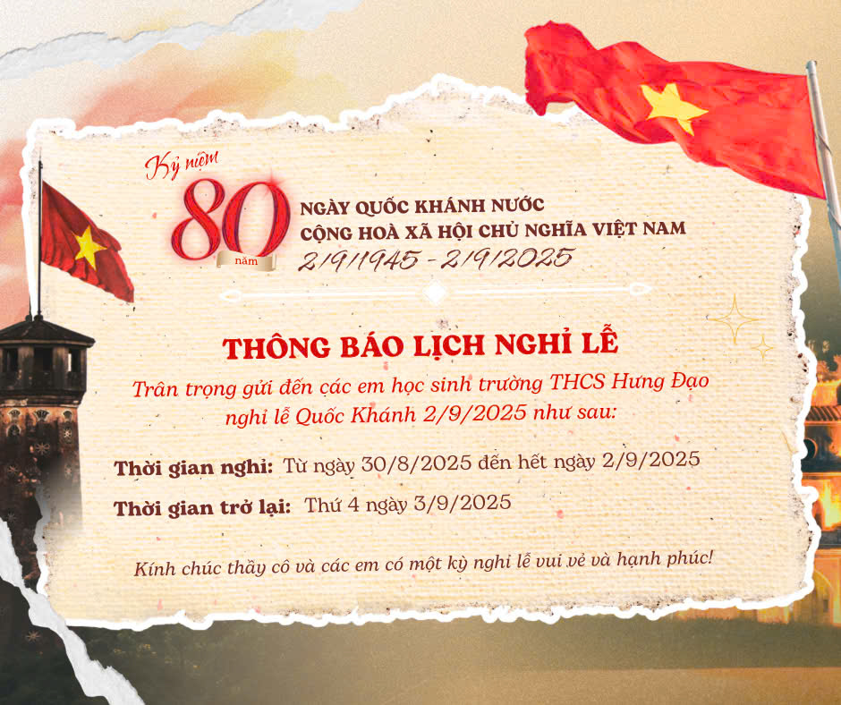 Nhà trường sẽ nghỉ lễ Quốc khánh 2/9 từ ngày 30/08/2025 đến hết ngày 02/09/2025 (theo quy định).
